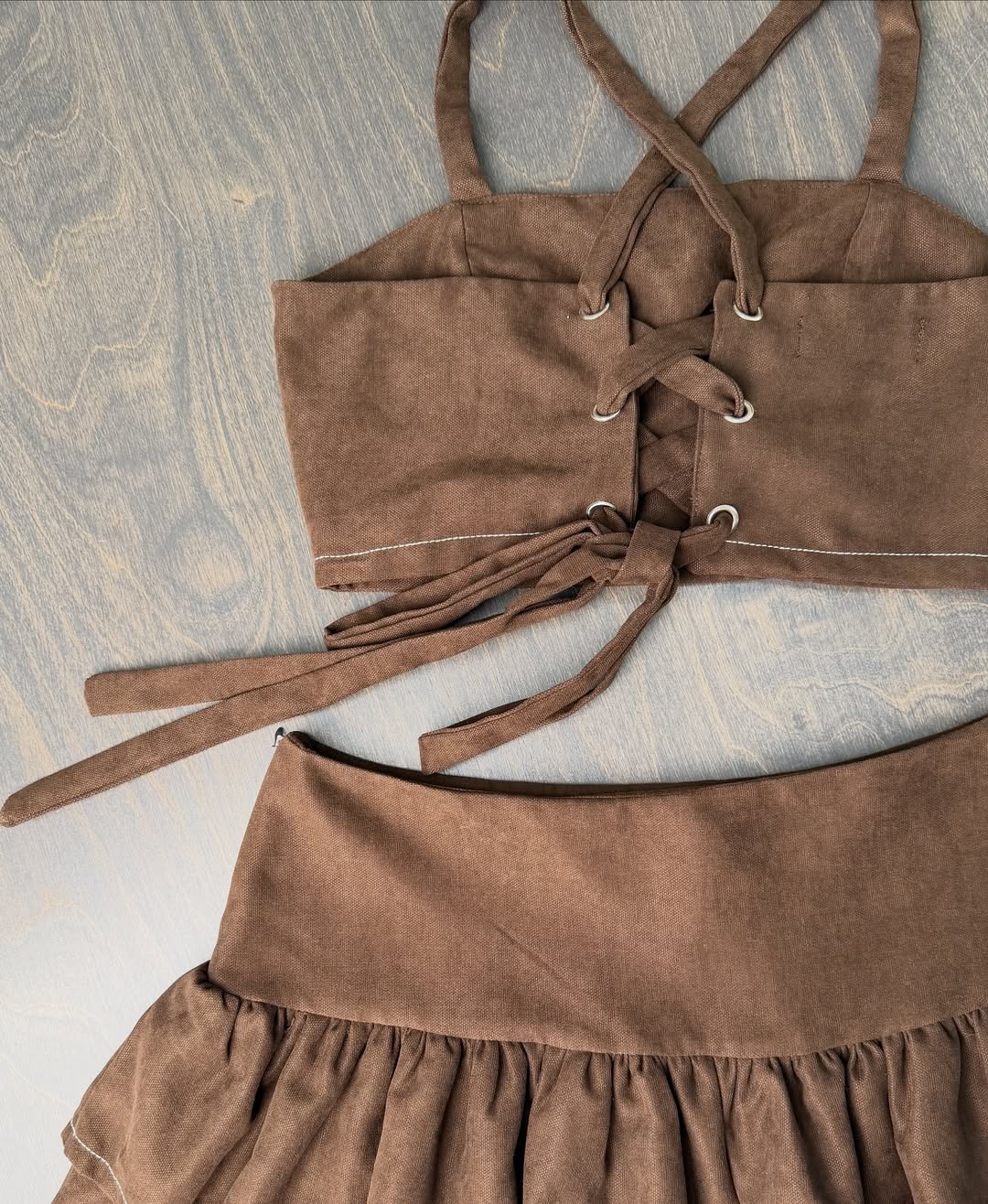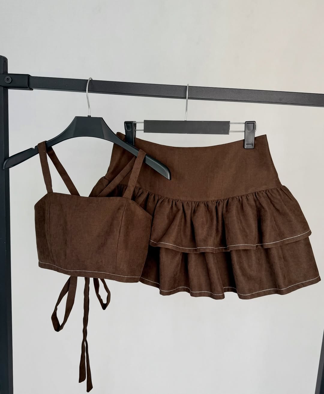 این ست زیبا شامل دامن و کراپتاپ است که از پارچه کتان مخمل گِرمدار ساخته شده و در رنگهای قهوهای، کاربنی و پستهای موجود است.